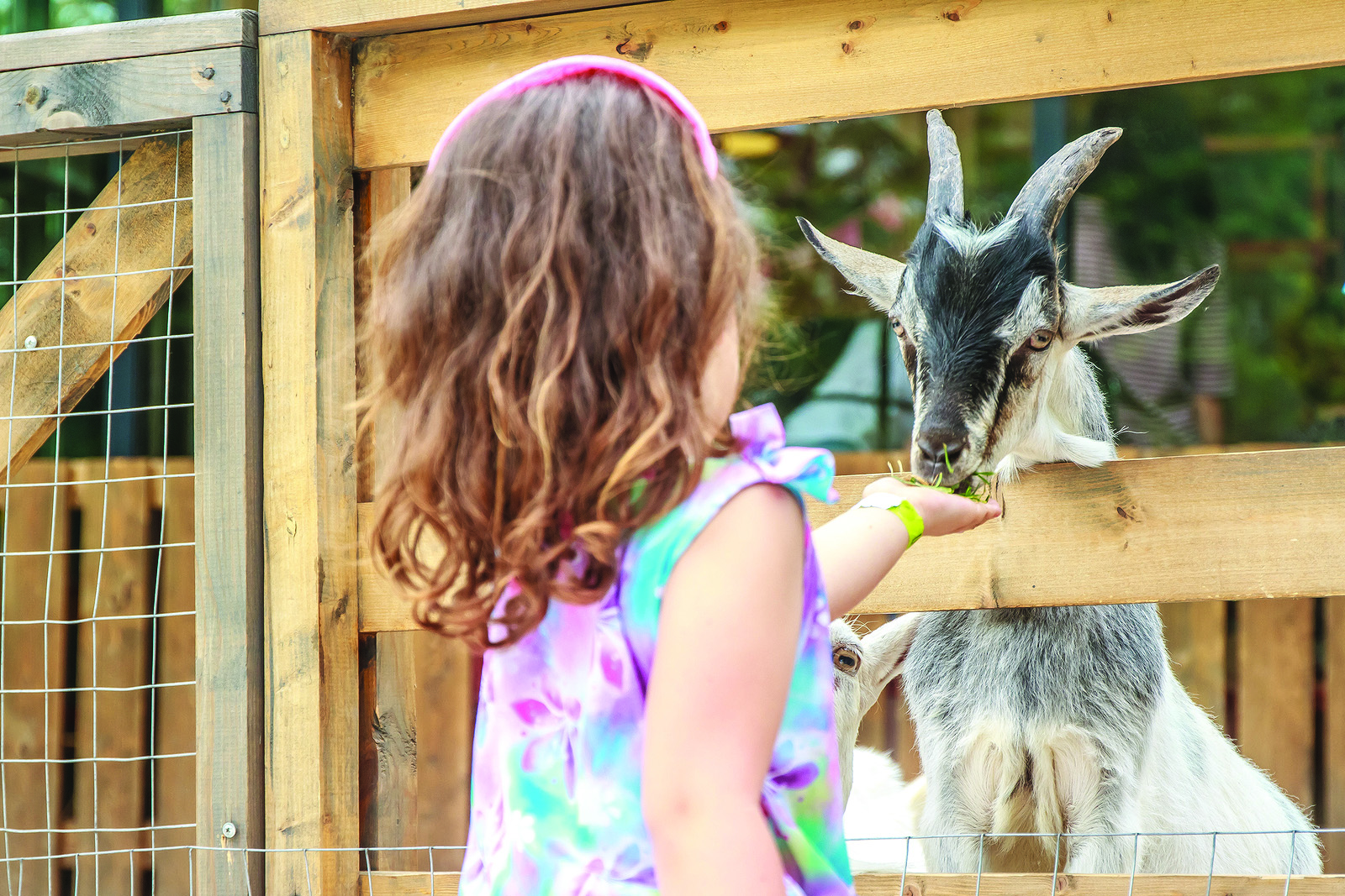 outdoor portrait of young happy young girl feeding goat on farm
