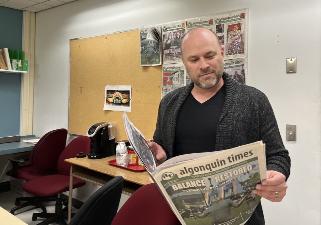 Jon Willing, in the Algonquin Times newsroom, reads an edition of the college newspaper produced by his journalism students. Photo credit: S. Gunner